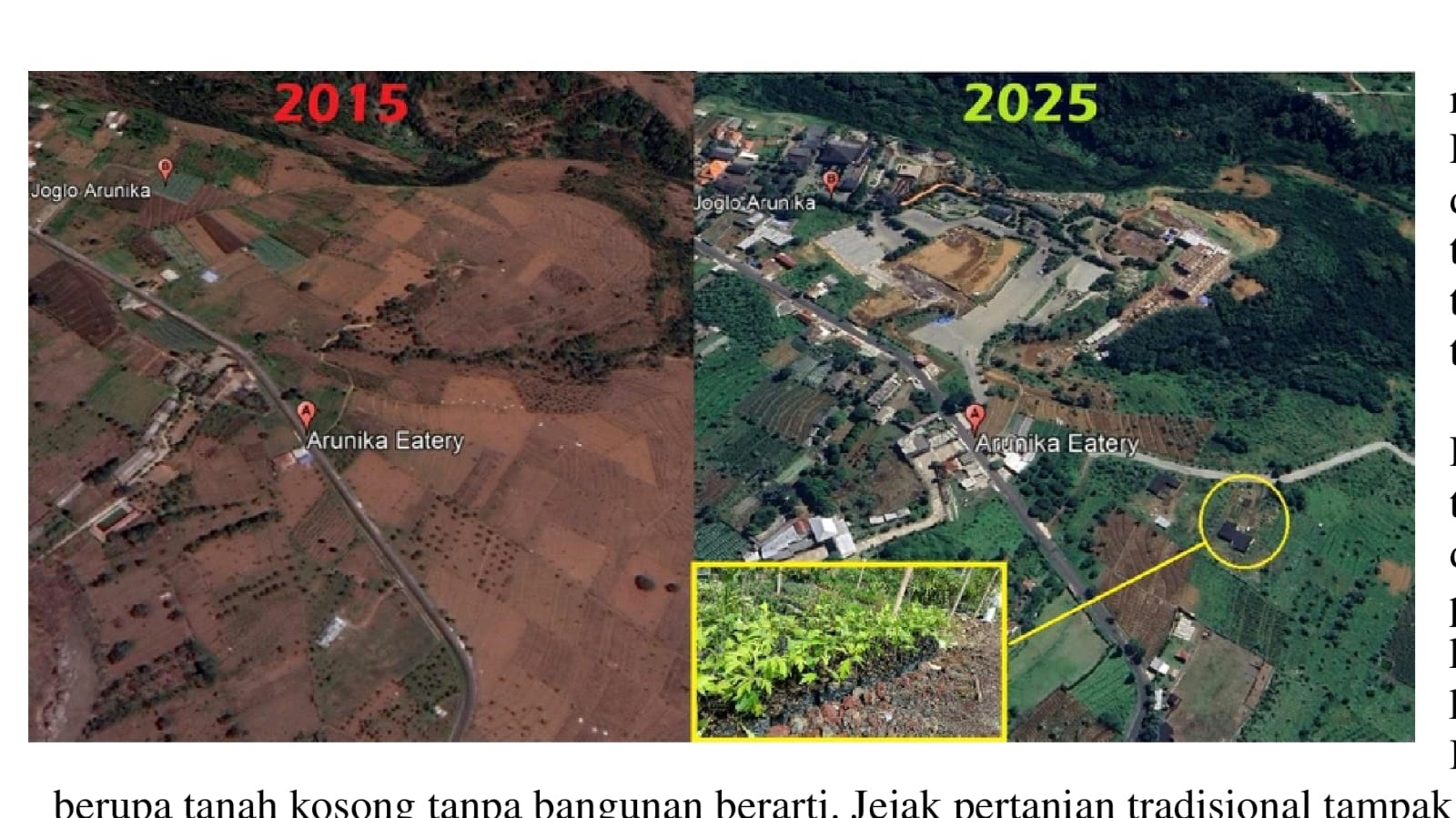 Transformasi lingkungan objek wisata Arunika bukan sekadar narasi. Perbandingan citra satelit di google, antara tahun 2015 dan 2025, satu dekade menjadi saksi.